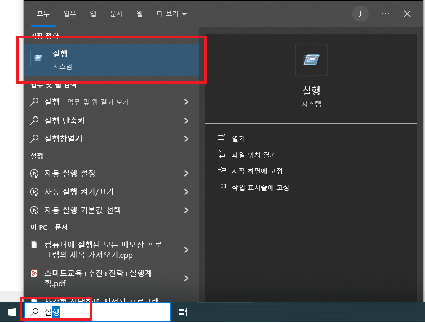 윈도우 키 옆의 검색 창에 "실행" 을 입력하세요. 가장 위쪽에 뜨는 네모칸을 클릭하면 실행 프로그램이 뜹니다.